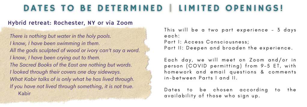 This will be a Hybrid Retreat. You can participate in person (in Rochester, NY, or with others in your own location) or via Zoom. Each day, we will meet on Zoom and/or in person (COVID permitting) from 9-5 (to allow for participants from California to Warsaw). We will meet together 9-11, 12-2, 3-5; each meeting will include an exercise and discussion period, followed by a break. We are also going to have homework and email questions and comments in-between Parts I and II.